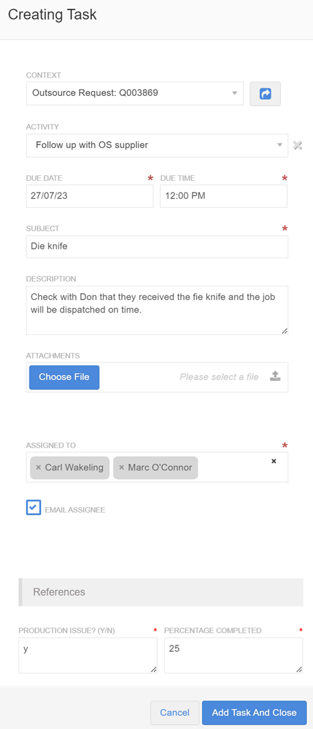 Tasks can be created for specific requirements to be actioned and assigned to the user(s) that will be responsible to complete those tasks.