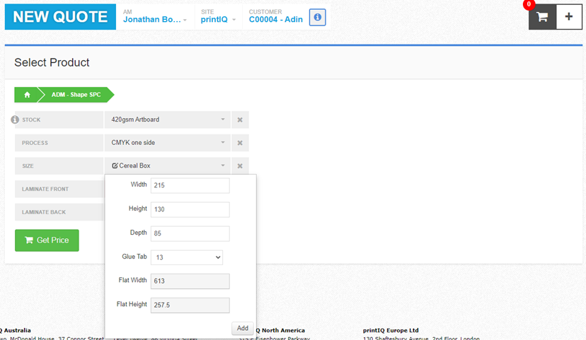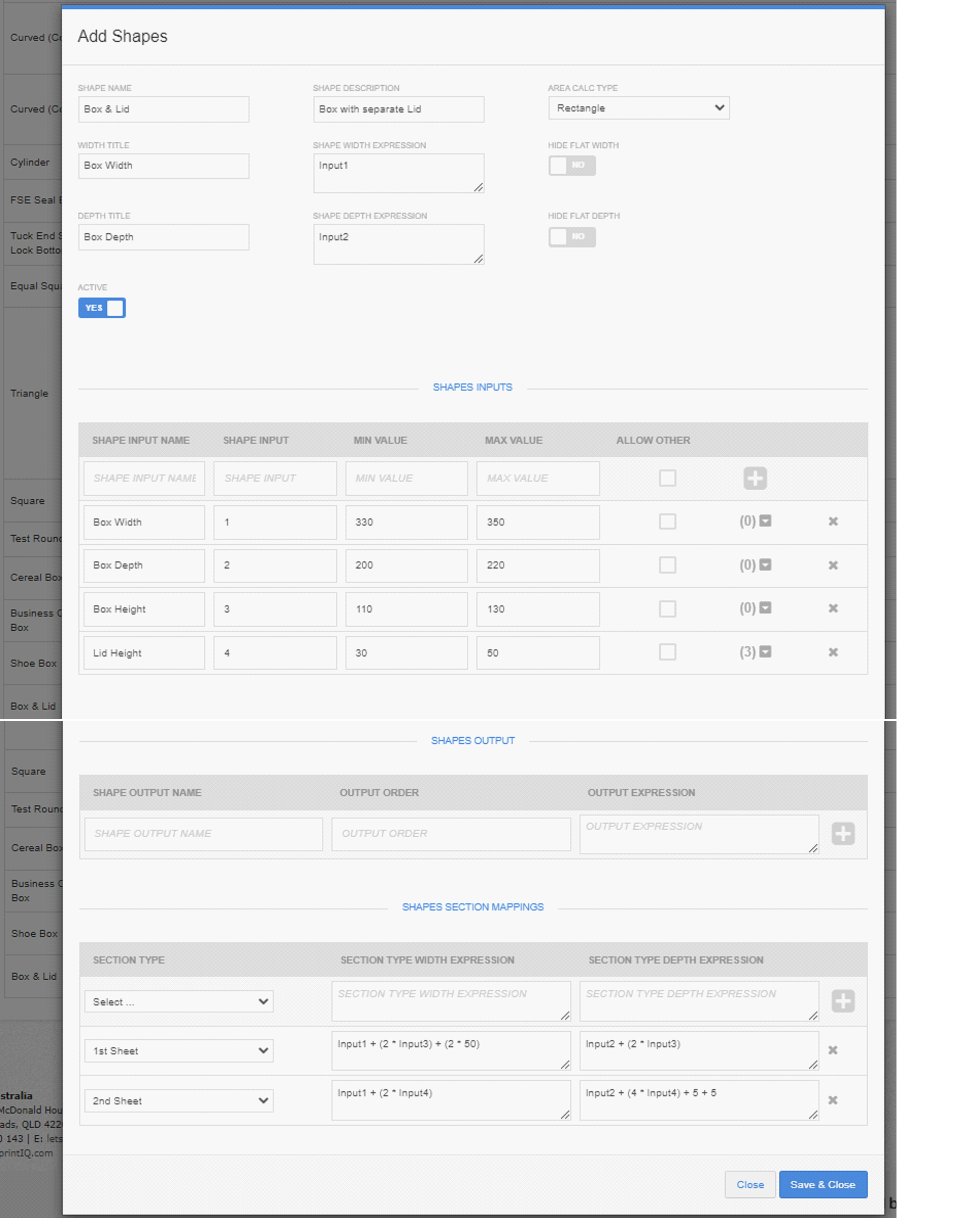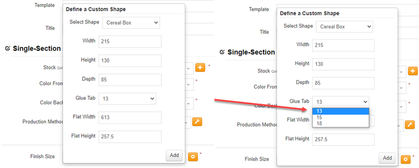 - Hide Flat Depth – Yes/No option for displaying flat size in the shape selector dropdown when quoting