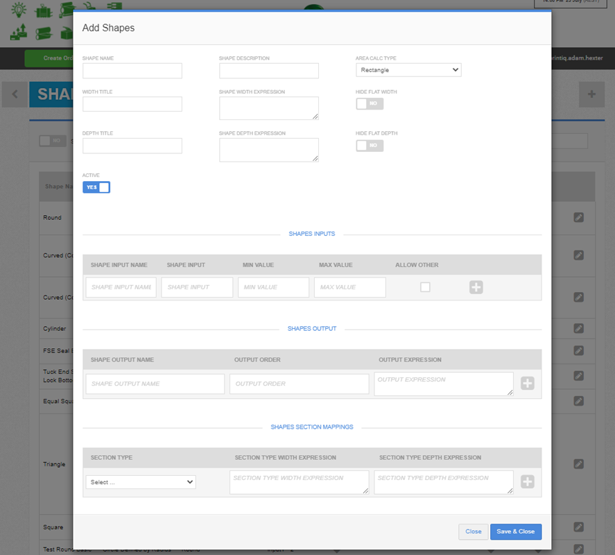 Using the shape creator, users can configure the formulas for use later in custom and simplified quotes.