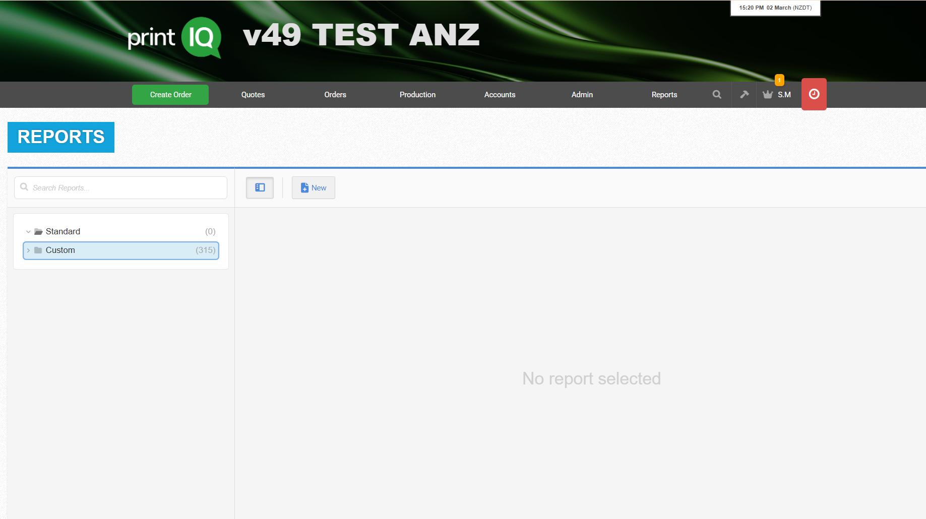 After clicking the Reports button you will be taken to the Reports page. Here you will see two folders; Standard and Custom. Standard contains all of printIQ's standard reports. The Custom folder will hold anything created new or copied from the Standard folder.