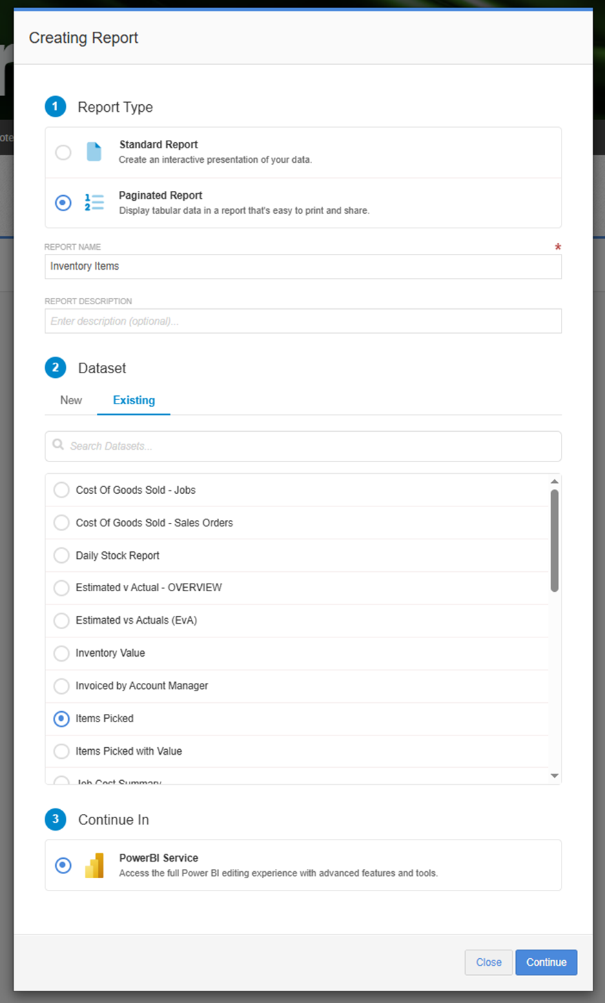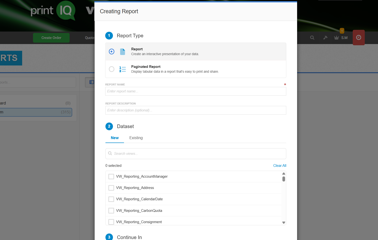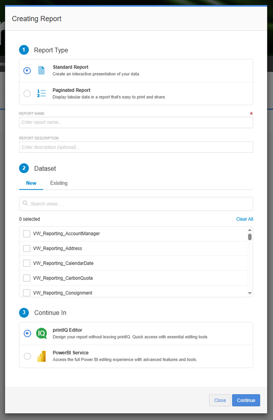 After selecting a report type, the report must be given a name. Next a view or multiple views must be selected to create a new dataset or existing dataset can be selected from the 'Existing' tab. After selecting a dataset/views to use in your report, you must choose whether to continue in the printIQ Editor or to continue in the PowerBI Service. Next, the 'Continue' button must be clicked: