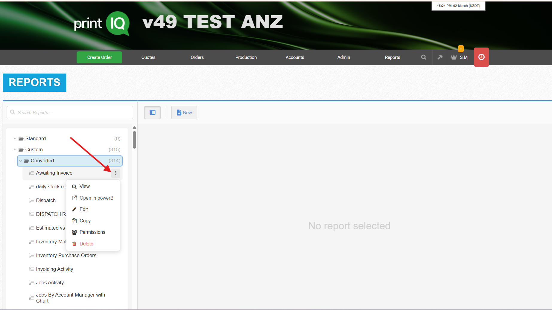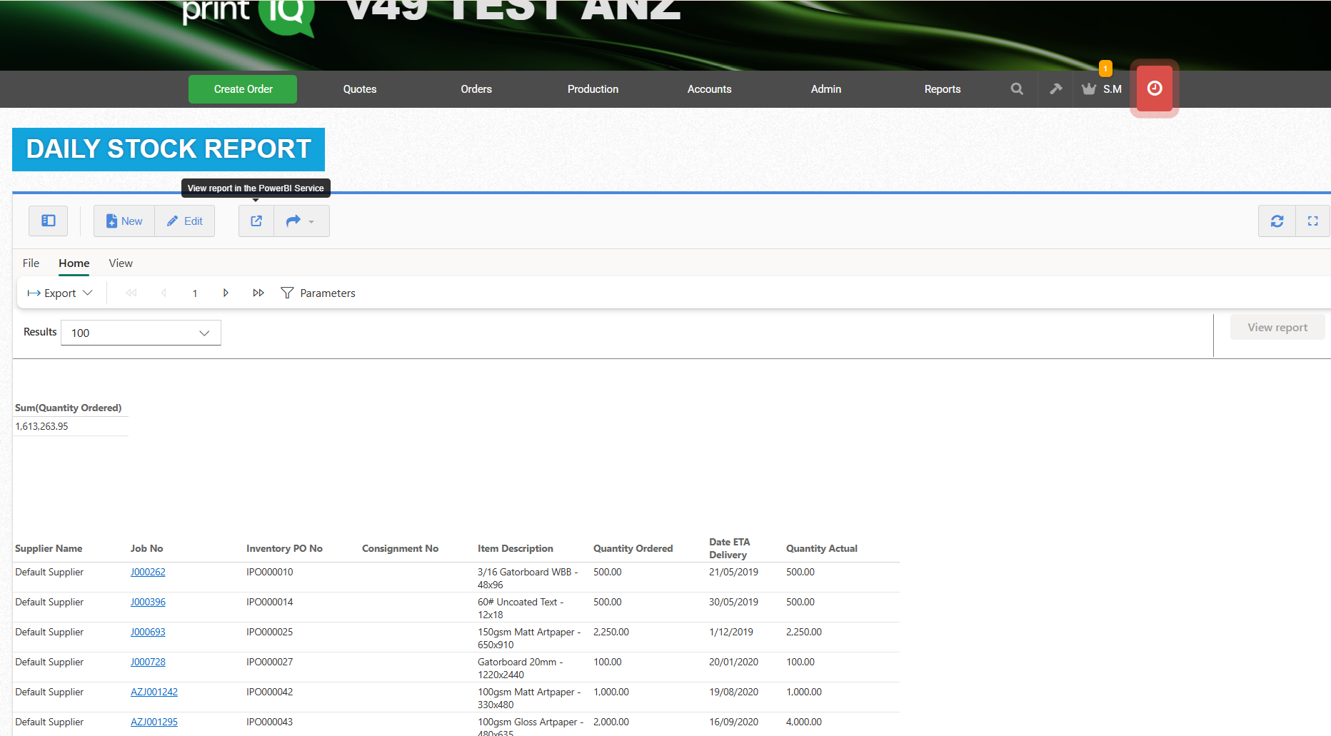 View will load the report inside printIQ (same will happen when the report name is clicked from the menu).